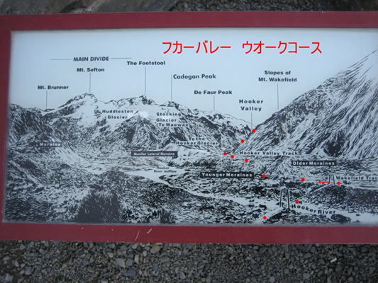 点線に沿って、氷河を吊り橋で渡り、堆積の中をフッカーバレーに向かう (現地の案内板)